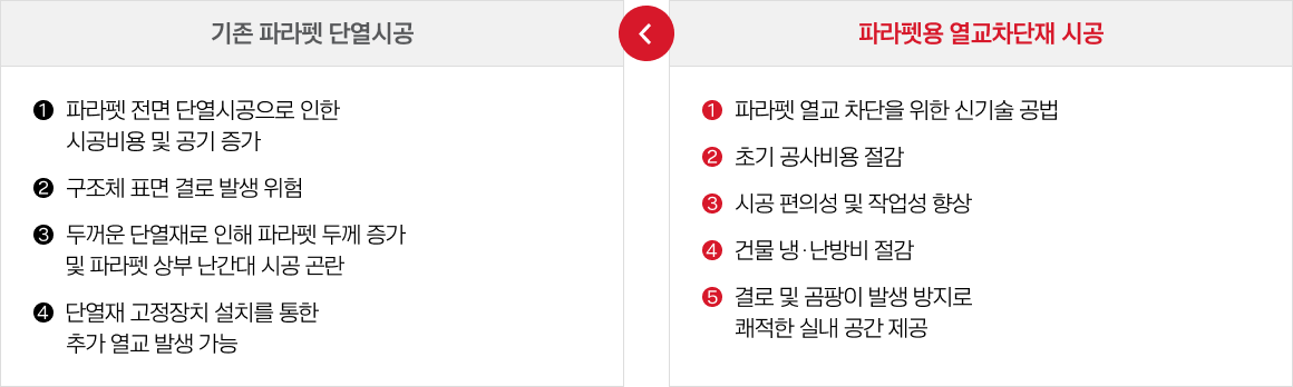 단열재의 연속 시공을 위해 구조체 전체를 감싸는 번거롭고 복잡한 단열 공사 대신, 파라펫 구조체 하부에 열교차단재를 적용하면 간편하고 경제적인 단열 시공이 가능합니다.
